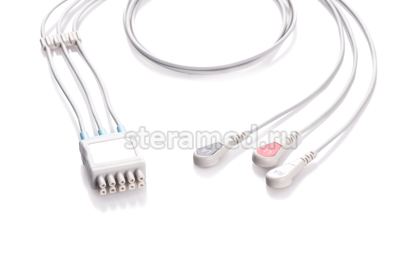 ЭКГ кабель отведений пациента 3 отведения, кнопка для Dash 1000, 2500, 4000, 5000, PRO2000, PRO3000, PRO4000, Eagle, MAC-Lab, Solar 3000, 8000, 9500, Tram 100, 200, 300, 400, 451, 500, 600, 800; Logiq 5, 7, Vivid E9, I; Ultraview 90492, 91220, 90496